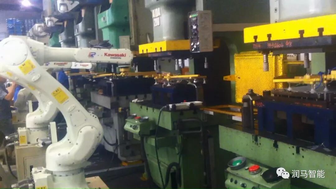 二是机器人冲压连线:通过多台机器人在多台压力机之间建立冲压连线。根据加工工件成形工艺要求,需要在多台压力机配合加工,整条生产线由拆垛机器人,上料机器人、压力机之间传输搬运机器人,尾线机器人组成。与直线坐标的机械手相比,采用工业机器人更有柔性,对模具没有等高要求,容易集成。