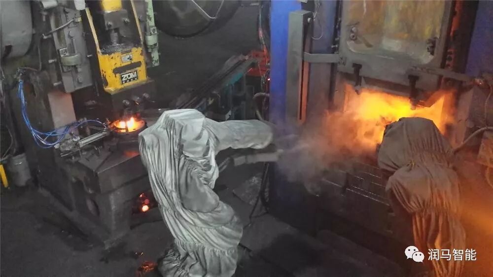 热模锻机器人集成应用通常配置两台机器人,一台负责将中频炉处理后的高温物料移送给冲压成形模锻压机,另一台负责从冲压成形模锻压机取料后移送到另一台模锻压机进行切边。